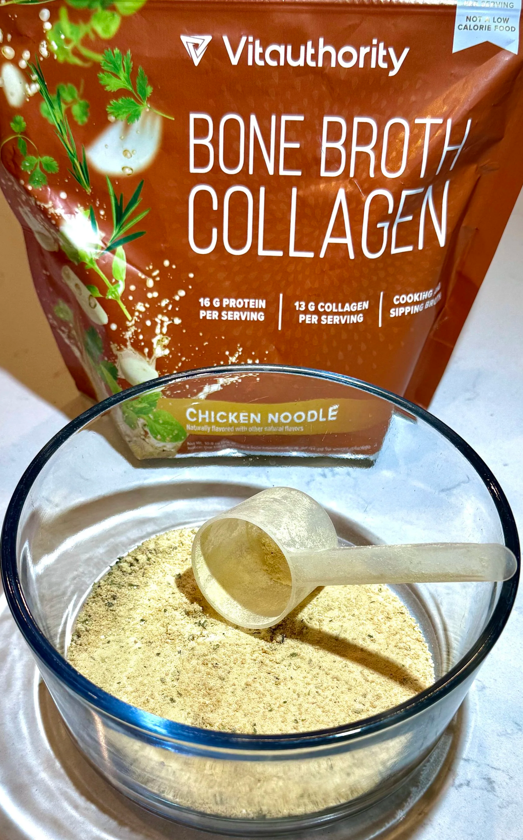 Instead of traditional boxed broth, we’re using Vitauthority bone broth collagen.