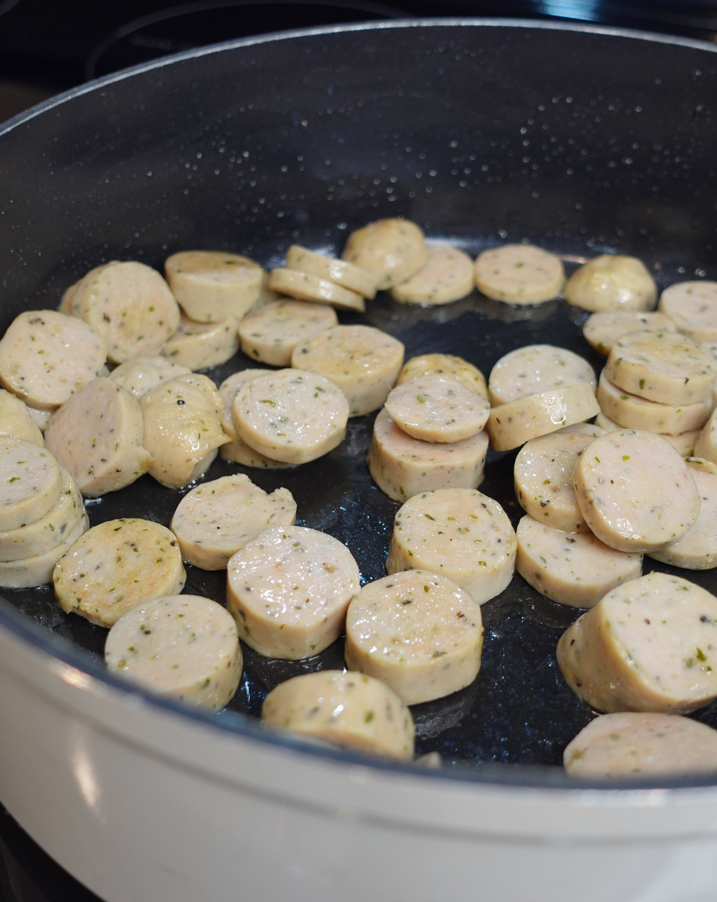 In a large skillet, heat olive oil over medium heat. Add sliced chicken sausage and cook for 2–3 minutes per side until browned. Remove from pan and set aside.