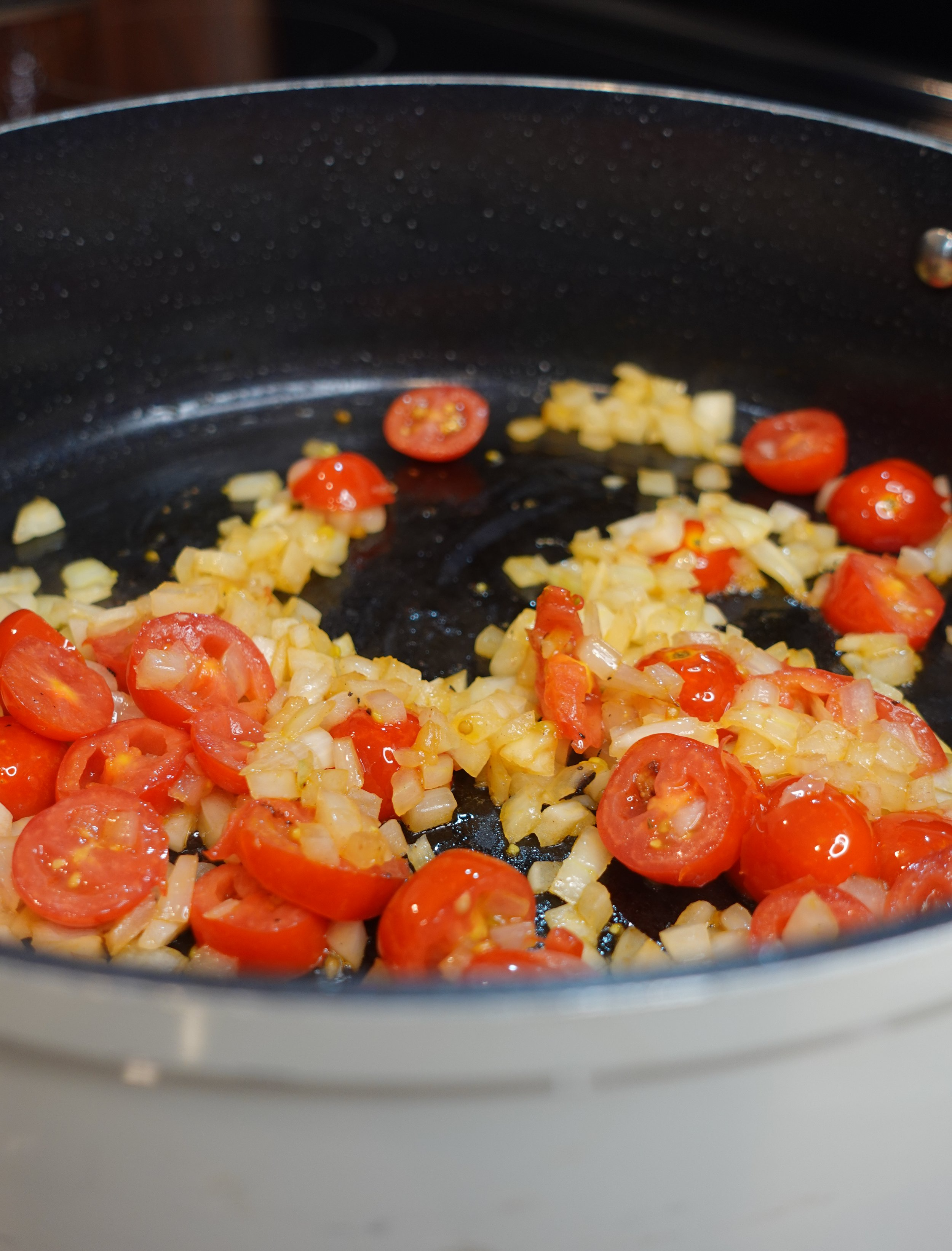 In the same skillet, add diced onion and tomatoes and cook until softened, about 3 minutes. Stir in minced garlic and cook for 1 more minute.
