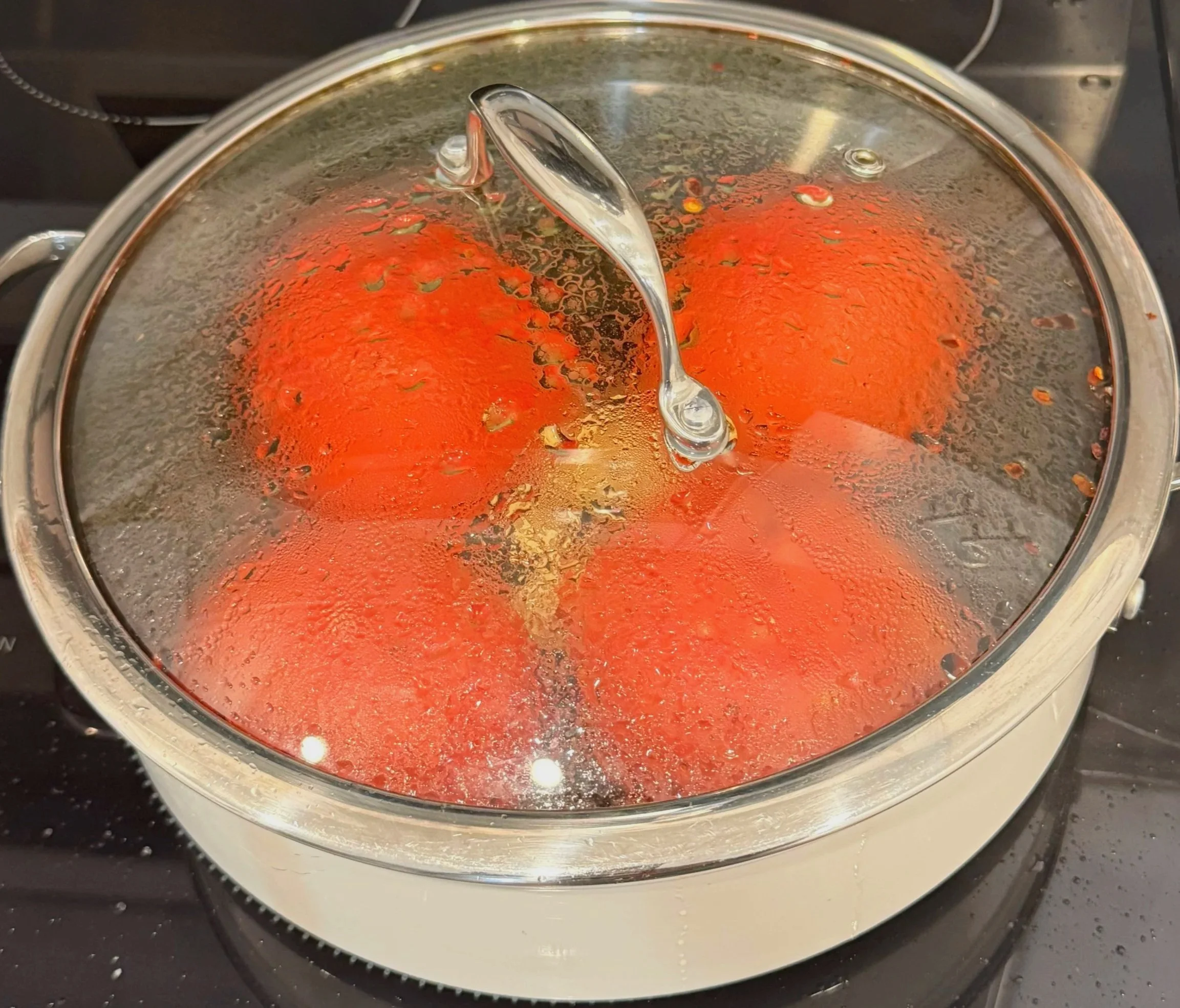 I steam whole fresh tomatoes with garlic, peel them, mash them into the pan, and finish the sauce with cream and mozzarella for the easiest creamy tomato spaghetti ever.
