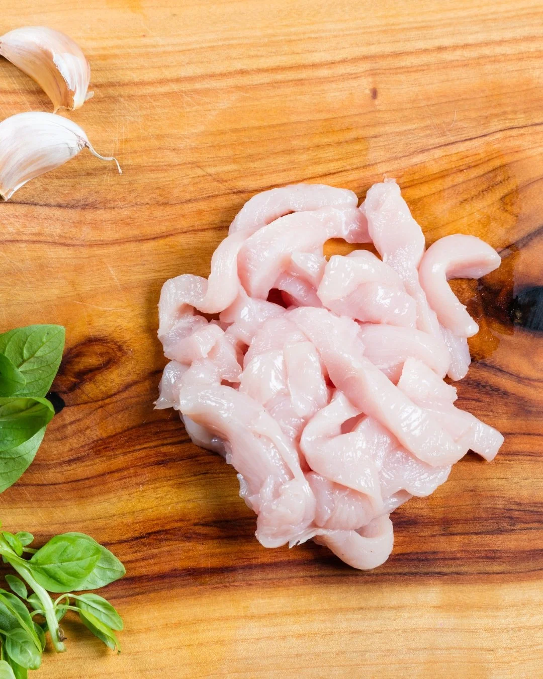 Slice the chicken breasts into thin strips - about ½-inch wide and cut against the grain for tender bites that cook evenly and quickly.