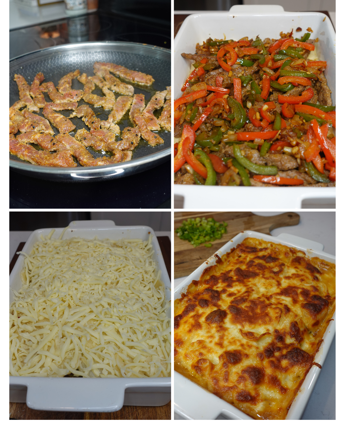 A cheesy, beefy twist on a classic—layers of tender steak, peppers, and creamy scalloped potatoes baked to golden perfection.