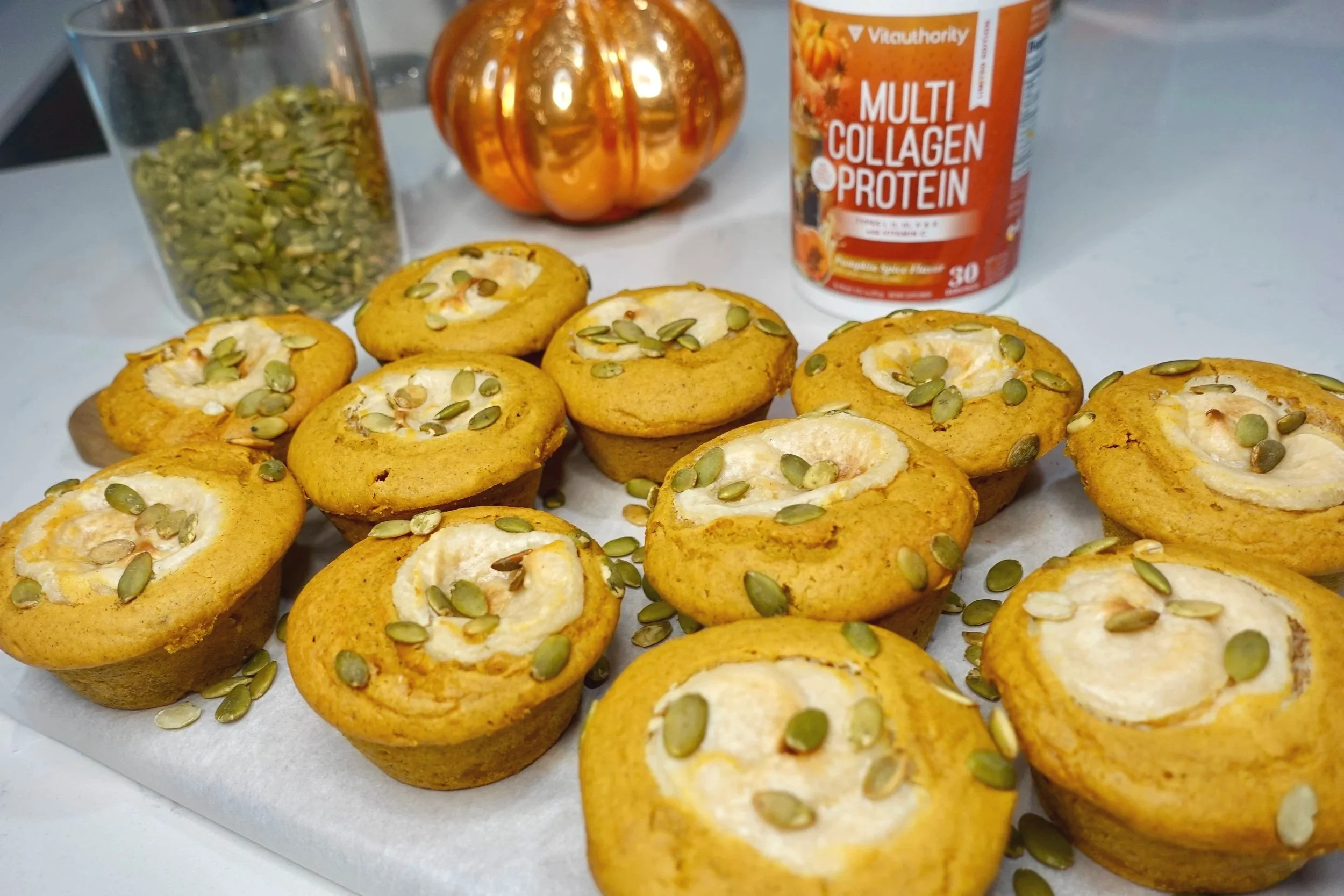 These muffins are moist, tender, and perfectly spiced, with that creamy cheesecake-style center that makes every bite irresistible. I love baking a batch on Sunday so we have grab-and-go breakfasts and snacks all week long. Plus, you can even sneak in a scoop of pumpkin spice collagen for a little protein boost without changing the flavor.