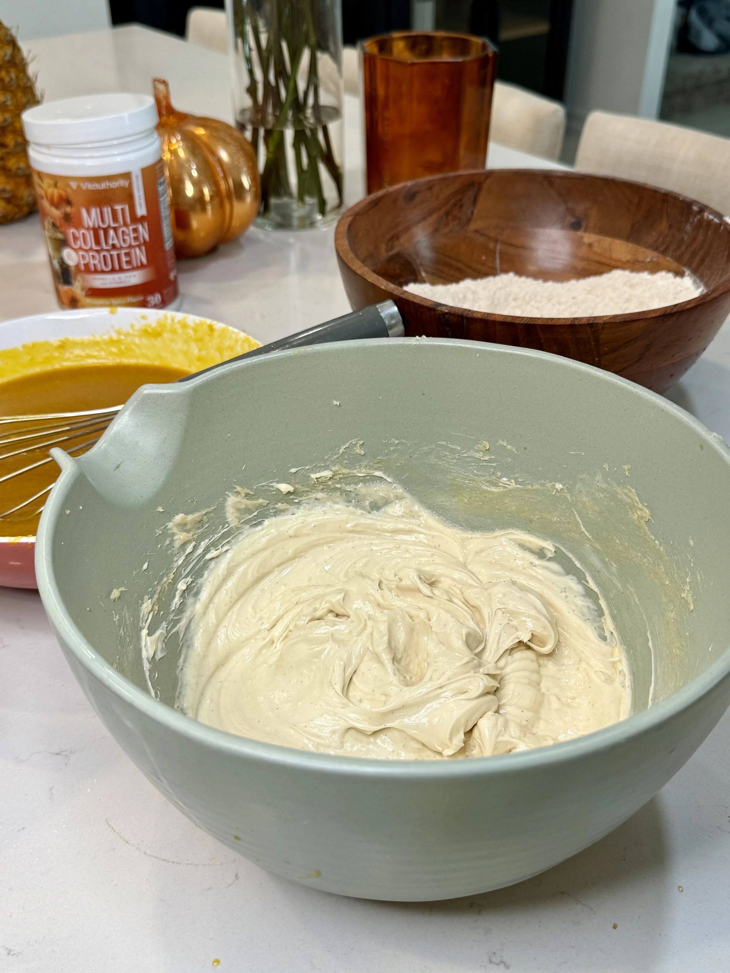 Mix wet ingredients: In a large bowl, whisk pumpkin puree, eggs, sugars, oil, and vanilla until smooth. Stir in collagen if using.